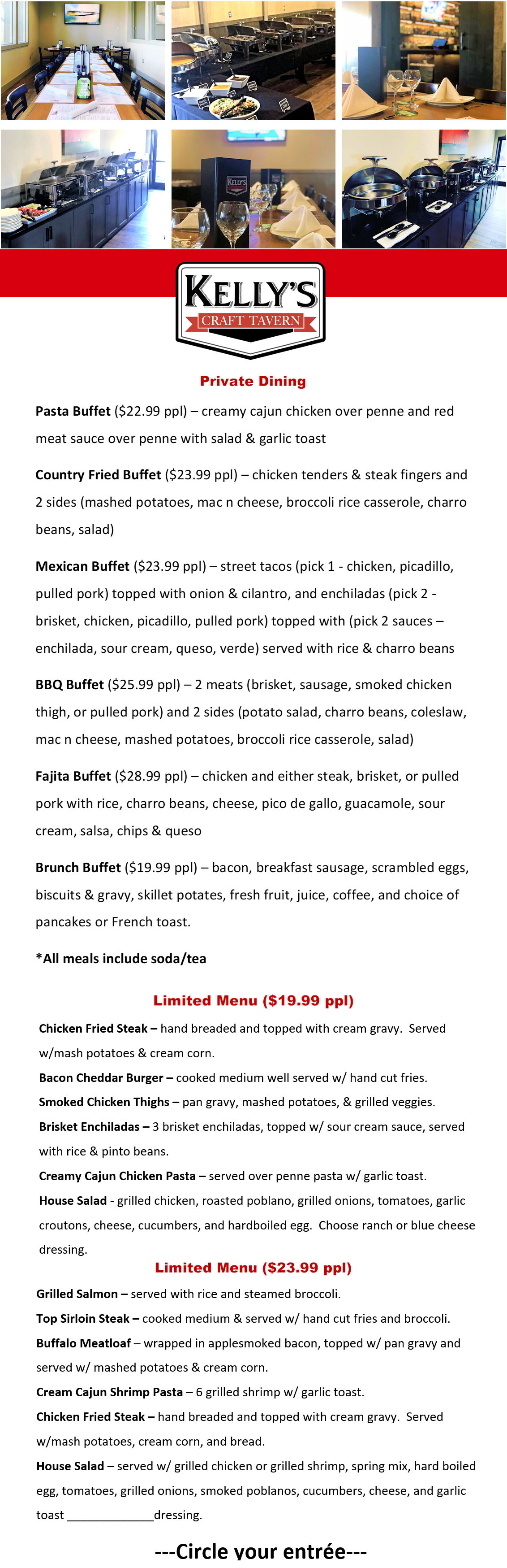 Reserve our private dining room at Kelly's Craft Tavern today for your next private dining and private party events! We have two private dining rooms that consist of a large room that seats up to 60 preople and a smaller private dining room that seats up to 30 people. You can also reserve part of our award winning covered patio. Great for business meetings, rehearsal dinners, birthday parties, graduation, or just a night out with friends.